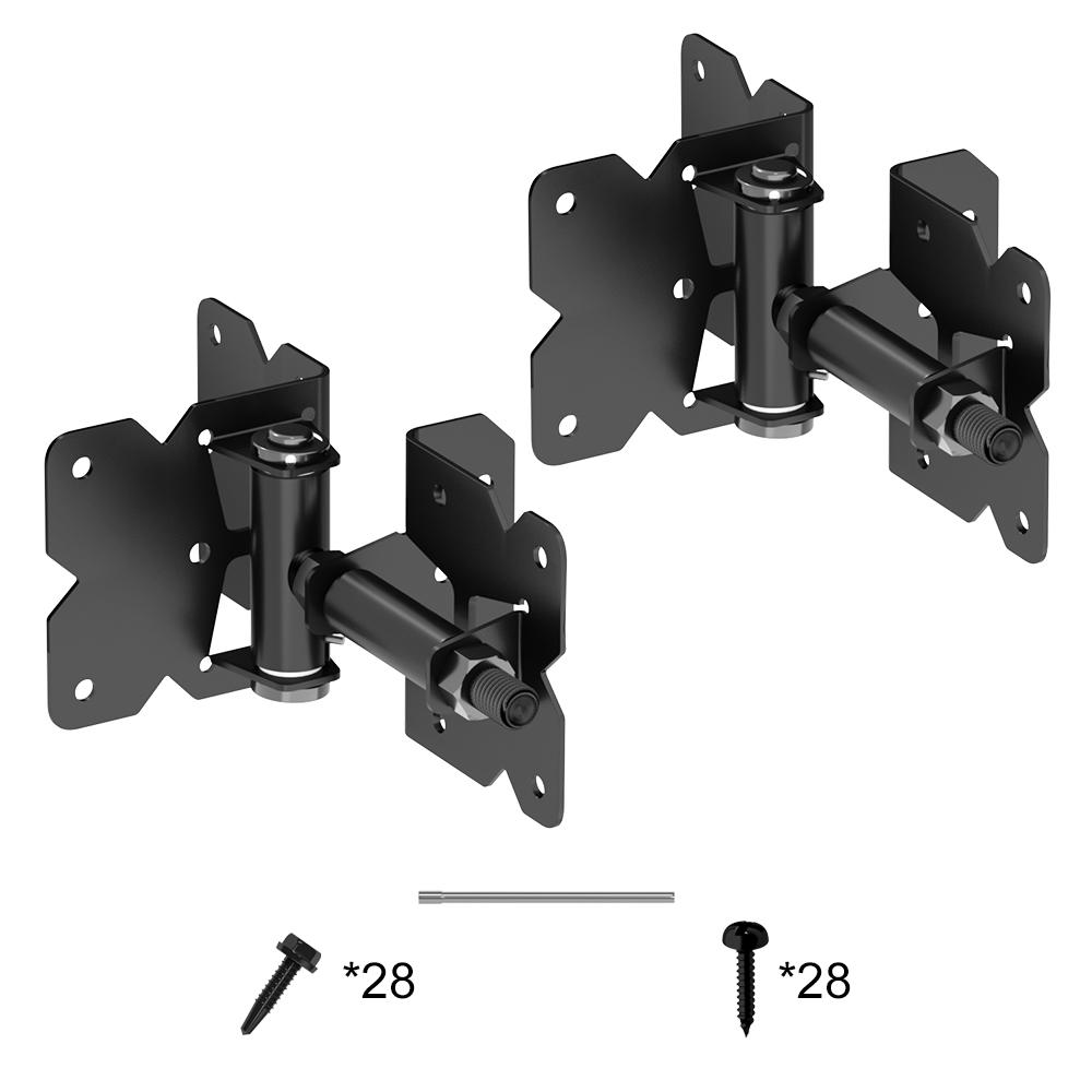 Includes gate hinges, latch and self drilling screws. The vinyl gate hinges in this kit are adjustable to fit a gap from 3/4" to 1-1/2" between the gate frame and the gate post. These are easy gate hinges to install (they come with instructions). Listing includes 2 hinges and 1 latch. Vinyl gate hinges are white in color providing a good look for wood, white, almond etc. color fences.